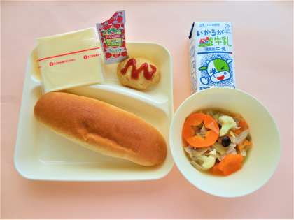 黒糖パン・牛乳・とうふハンバーグ・カリフラワーのスープ煮・スライスチーズ
