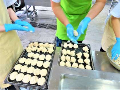 4人の給食調理員さんが1時間半かけて495個ものとうふハンバーグを作ってくれました。ふわっふわの焼き上がりで、大好評でした。