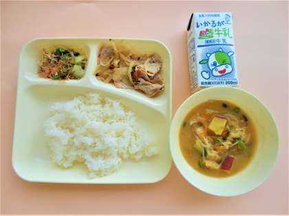 ご飯・牛乳・豚肉のしょうが焼き・さつまいものみそ汁・なのはなのおひたし
