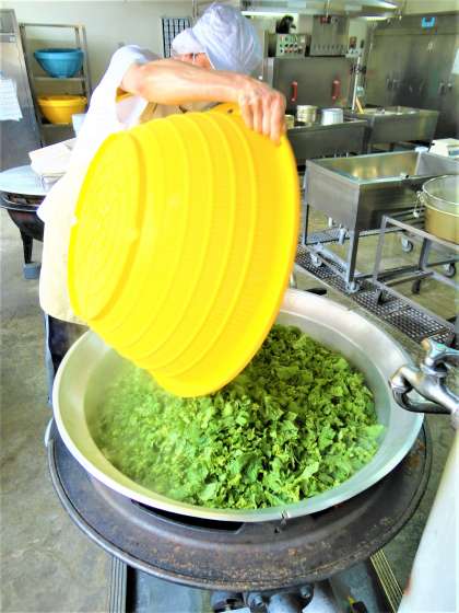 今日の給食は、今の時期しか食べられない旬のなのはなをはくさいと合わせ、おひたしにしました。