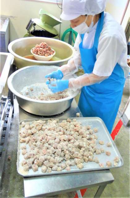 まぐろにでん粉をまぶして揚げ、赤みそ、砂糖、ケチャップで作ったタレをからめました。