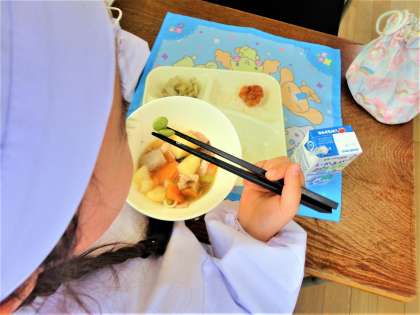 また、煮ものに入っていた枝豆も、箸を上手に使って食べている姿が見られました。
