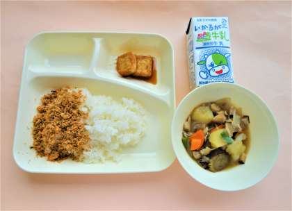 ご飯・牛乳・鶏肉とじゃがいもの煮もの・あつあげのしょうゆだれかけ・紅ざけそぼろ