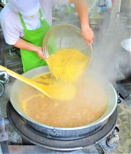 給食室では、児童が食べる頃にちょうどよい硬さになるように、スパゲッティを短時間で茹で上げ、スープと合わせています。