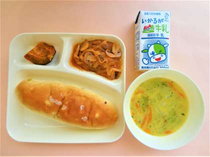 おさつパン・牛乳・煮込みハンバーグ・キャベツとコーンのスープ・焼きかぼちゃ