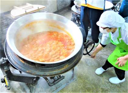 煮込みハンバーグは、ハンバーグが割れないよう、回転釜をゆすりながらじっくり煮込みました。