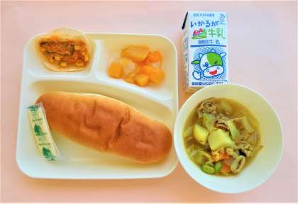 コッペパン・ソフトマーガリン・豚肉と野菜のカレースープ煮・変わりピザ・ミックスフルーツ(缶)