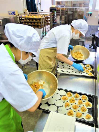 今日は、給食室で一つひとつ手作りの「変わりピザ」が出ました。
