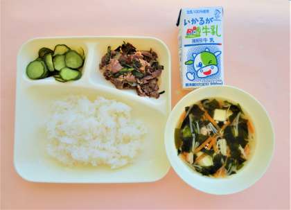 ご飯・牛乳・プルコギ・とうふとわかめのスープ・きゅうりの甘酢あえ