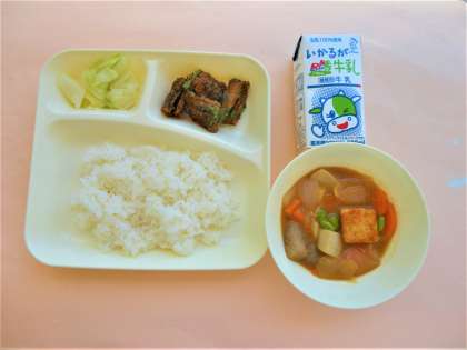 ご飯・牛乳・ちくわのいそべあげ・あつあげとさといものみそ煮・あっさりキャベツ
