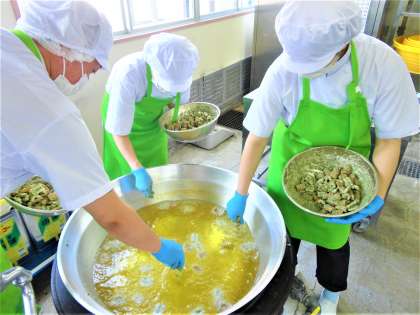 ちくわに衣を付けて揚げる作業は、3人がかりで手早く進めました。