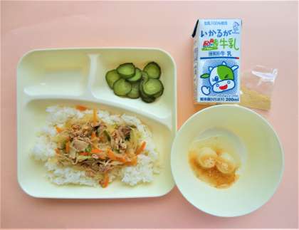 豚丼・牛乳・きゅうりの梅風味・白玉だんごのきな粉がけ