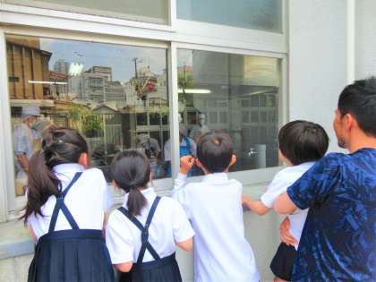 給食調理員さんのお仕事について説明を聞いた後、給食を作っている様子を窓の外から見学しました。