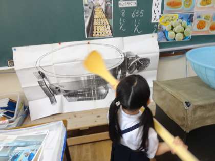 1年生にとっての初めての栄養指導は、給食がどのように作られているかを知り、「きゅうしょくはかせ」になることをめあてにしました。