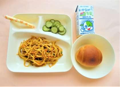 今日の給食には、毎回大好評のカレースパゲッティが登場しました。