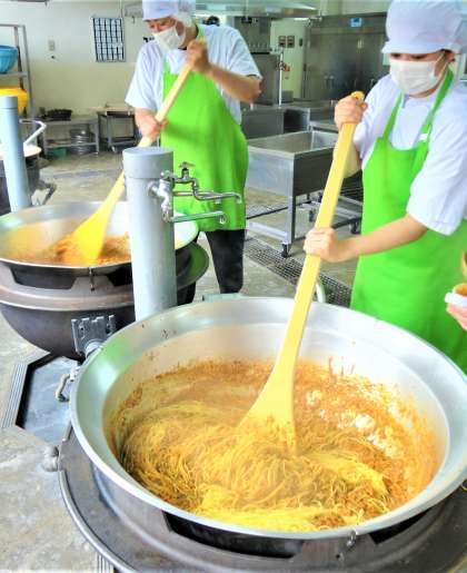 給食では、児童が食べる頃に食べやすい硬さになるよう、硬めにゆであげてソースと絡めています。