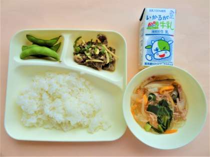 ご飯・牛乳・チンジャオニューロウスー・ハムと野菜の中華スープ・えだまめ