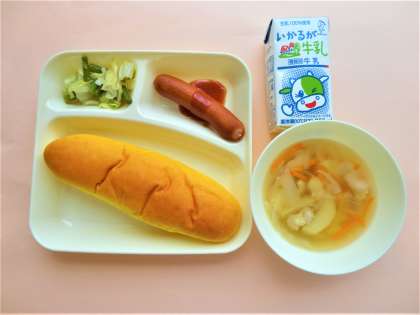 パンプキンパン・牛乳・ウインナーのケチャップソース・スープ・キャベツとさんどまめのサラダ