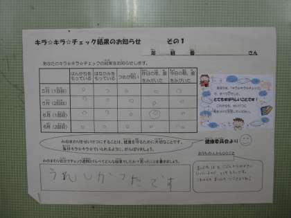 1学期の終わりには、担当クラスの一人一人の結果を集計し、全部○のついた子供たちにご褒美シールを貼っています。2学期もキラキラチェックを頑張っていますので、○がつくようにご家庭でもご協力よろしくお願いします。また、感想の記入もよろしくお願いします。