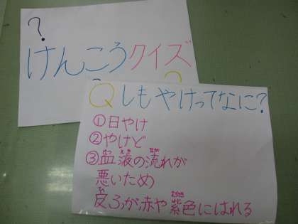 5,6年生の健康委員会メンバー17人が、月に1〜2回担当クラスへ行き、キラキラチェックをしています。チェック項目は、はんかち・はなかみを持ってきているかどうか、爪は伸びていないかどうか、朝・夜の歯みがきをしたかどうかです。チェックする前には健康に関するクイズを出しています。