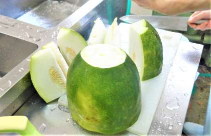 今日は、夏が旬のとうがんを、鶏肉と一緒に炊いて煮ものにしました。