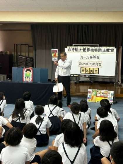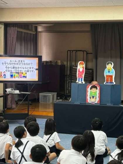 元警察官の方に来ていただき、防犯教室を行いました。今回は特に、ペープサートを使い、万引きについてのお話をしてもらいました。ものを買わずに持っていくことは、たとえ金額が小さくてもやってはいけないこと、そして、家族や大切の人を傷つけることになることを改めて考えることができました。