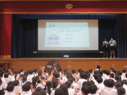 今日の児童集会は、様々なキャラクターに関するクイズでした。知っているようで知らないことがあったり、勘違いして覚えていることがあったりで、答えが発表されると、「えー!そうやったん!」と驚きの声があがっていました。