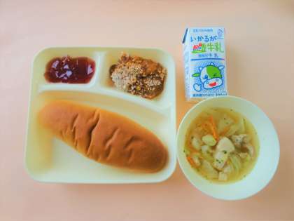 黒糖パン・牛乳・なすのミートグラタン・スープ・ダイスゼリー(ぶどう)
