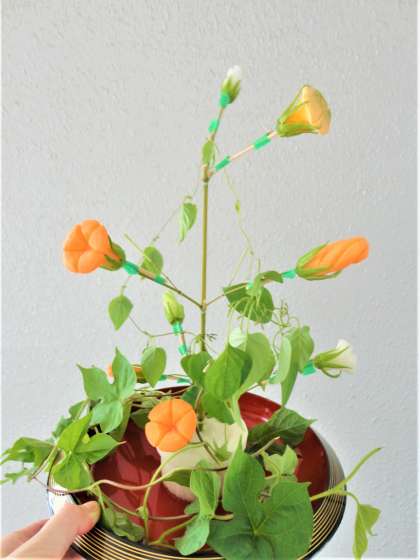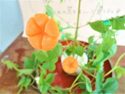 給食調理員さんが、にんじん、かぼちゃ、きゅうり、だいこんを使って、朝顔の花を作って持ってきてくれました。