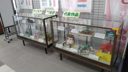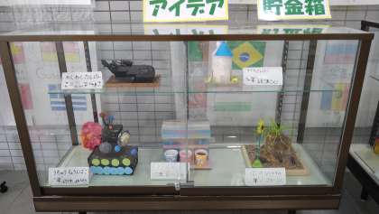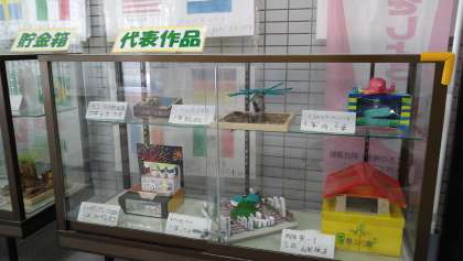 子どもたちが夏休みに作成した「アイデア貯金箱」はどれも力作ぞろいでしたが、その中でも各クラスで選ばれた代表作品が玄関ピロティに展示されています。思わず足を止めて見入ってしまう作品ばかりですね。
