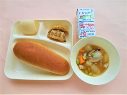 黒糖パン・牛乳・あげぎょうざ・鶏肉ととうがんの中華煮・二十世紀梨