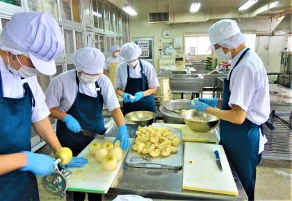 給食調理員さんが、食べやすいように皮をむいて、1人1/4切れずつに切ってくれました。