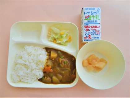 チキンカレーライス【米粉】・牛乳・キャベツとコーンのサラダ・白桃(カット缶)