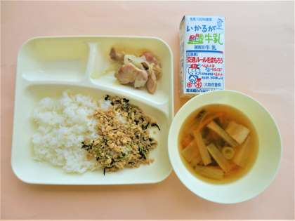ご飯・牛乳・鶏肉のゆず塩焼き・ソーキ汁・ツナ大豆そぼろ
