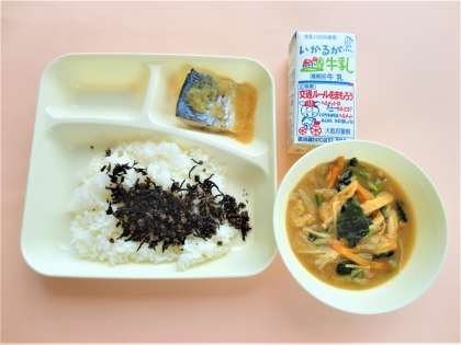 ご飯・牛乳・さごしのおろしじょうゆかけ・みそ汁・牛ひじきそぼろ