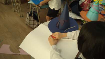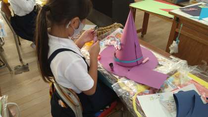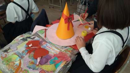 2年生が「作品展」に向けての作品作りに取り組んでいます。どのような飾りを作ろうかと考え、色や形を工夫して楽しみながら取り組んでいました。一人一人の個性が表れた楽しい作品になっています。どんなステキな帽子か完成するのか、作品展本番が楽しみです。