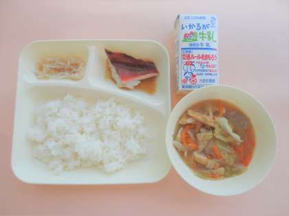 ご飯・牛乳・赤魚のしょうゆだれかけ・豚汁・もやしのゆずの香あえ