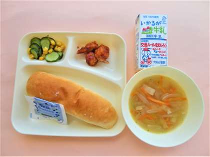 コッペパン・ブルーベリージャム・牛乳・まぐろのオーロラ煮・スープ・きゅうりとコーンのサラダ