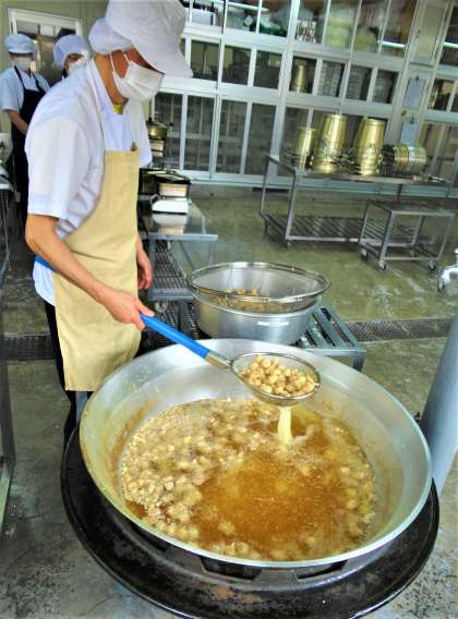 衣を付けて油で揚げたまぐろに、赤みそとケチャップで作ったタレをからめた大阪市の学校給食独自メニューです。