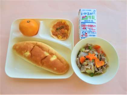 おさつパン・牛乳・豚肉と野菜のスープ煮・変わりピザ・みかん