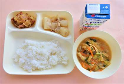 今日の給食【田辺だいこん葉のみそ汁・田辺だいこんの煮もの】