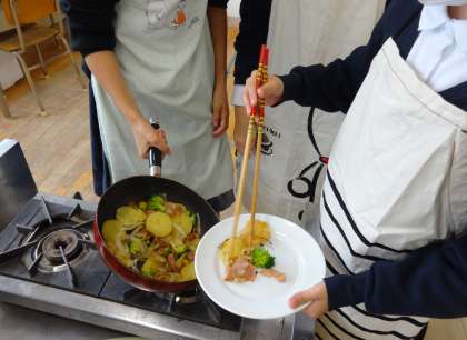 野菜のベーコン巻き、チャンプルー、ベーコンポテトの中から作りたい1品を選び、グループで協力して調理しました。