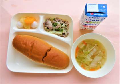 黒糖パン・牛乳・豚肉と野菜のソテー・はくさいのスープ・フルーツ白玉
