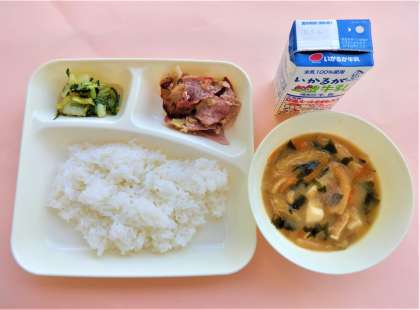 ご飯・牛乳・豚肉のねぎじょうゆ焼き・みそ汁・きくなとはくさいのごまあえ