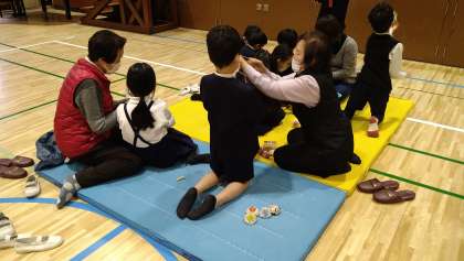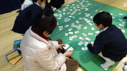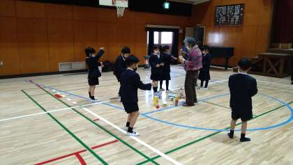 1年生が生活科で「むかしあそび」について学習をしています。今日は、地域の方をゲストティーチャーとしてお招きして、1年生が「むかしあそび」について色々と教えていただきました。1年生は、「かるた」「お手玉・あやとり・おはじき」「けん玉」「メンコ」「羽根つき」「こま」の各コーナーをまわり、楽しそうに遊んでいました。地域の方々には、様々なあそびを優しくわかりやすく教えていただき、子どもたちはとてもうれしそうでした。本当にありがとうございました。