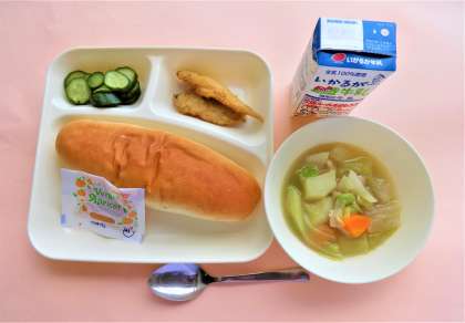 コッペパン・アプリコットジャム・牛乳・わかさぎフライ・洋風煮・きゅうりのピクルス