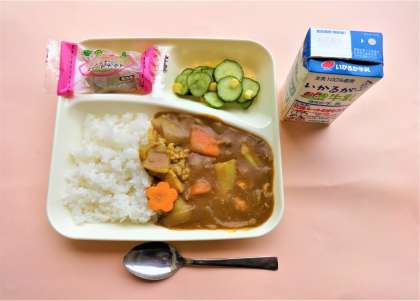 チキンレバーカレーライス・きゅうりとコーンのサラダ・スイートポテト・牛乳