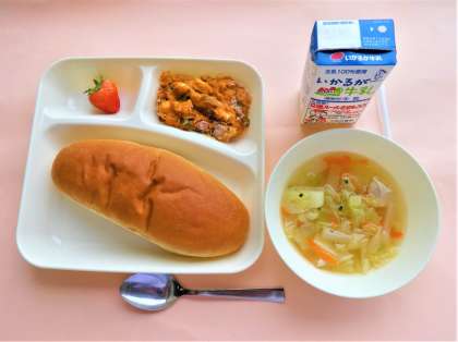 黒糖パン・牛乳・とうふのミートグラタン・じゃがいもと野菜のスープ・いちご