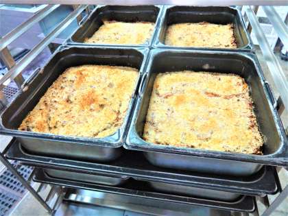 とうふのミートグラタンは、牛ひき肉、とうふ、たまねぎ、ピーマンを具材に、ケチャップやウスターソース等で味付けし、パン粉をふりかけて焼き上げました。