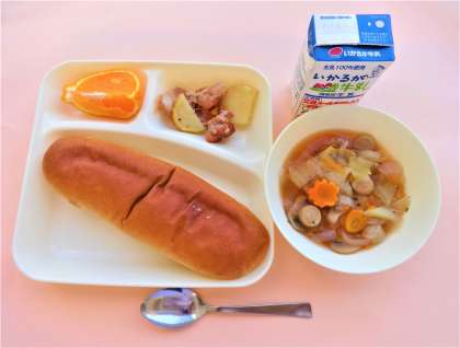 黒糖パン・牛乳・鶏肉とじゃがいものガーリック焼き・ウインナーとてぼ豆のスープ・デコポン